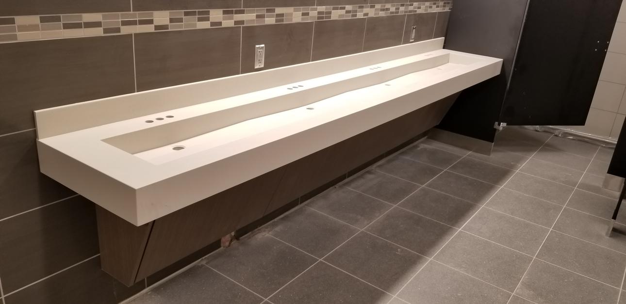 In the fall of 2017, Innovative was contracted to fabricate and install a large, custom trough sink for a millwork partner and their client. Capitalizing on the design flexibility of Corian Solid Surface, Innovative was able to design and fabricate a seamless, unique, solid surface trough vanitiy that would deliver functionality, ease of maintenance, durability, and lasting beauty for the project owner.