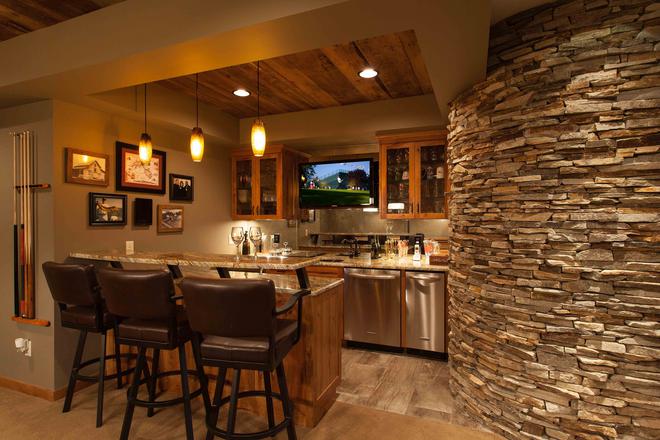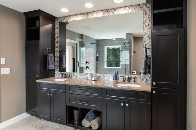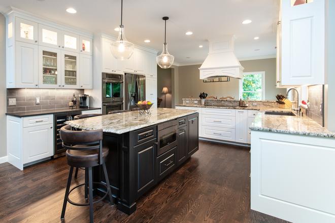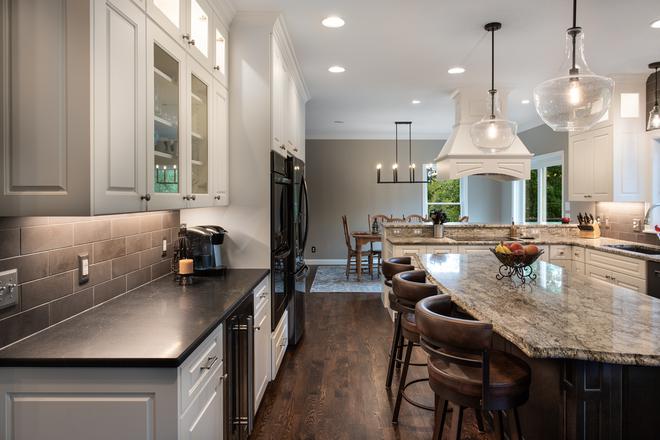 Exotic Natural Stone Waterfall Island, Countertops, and Full Height Backsplash